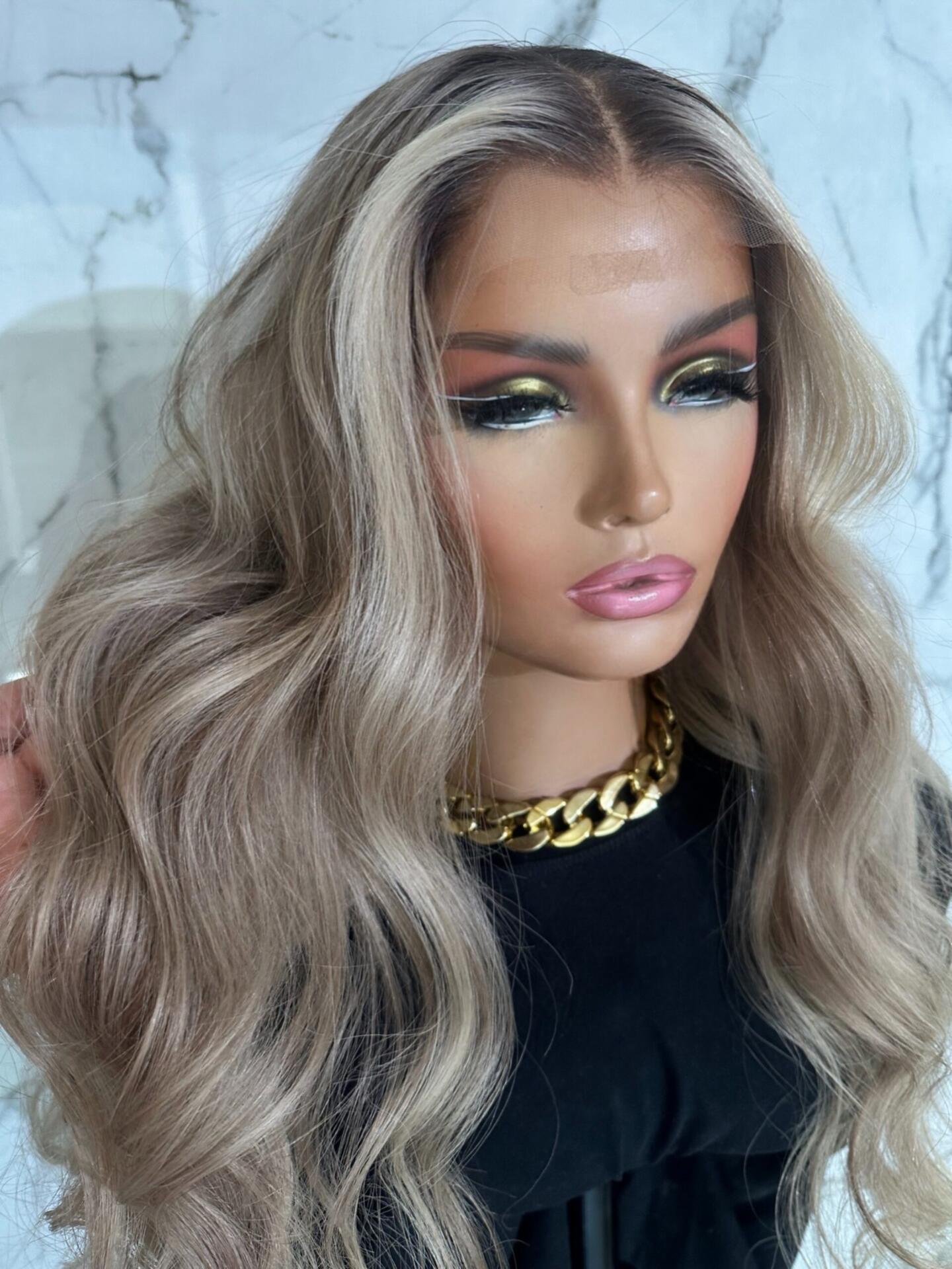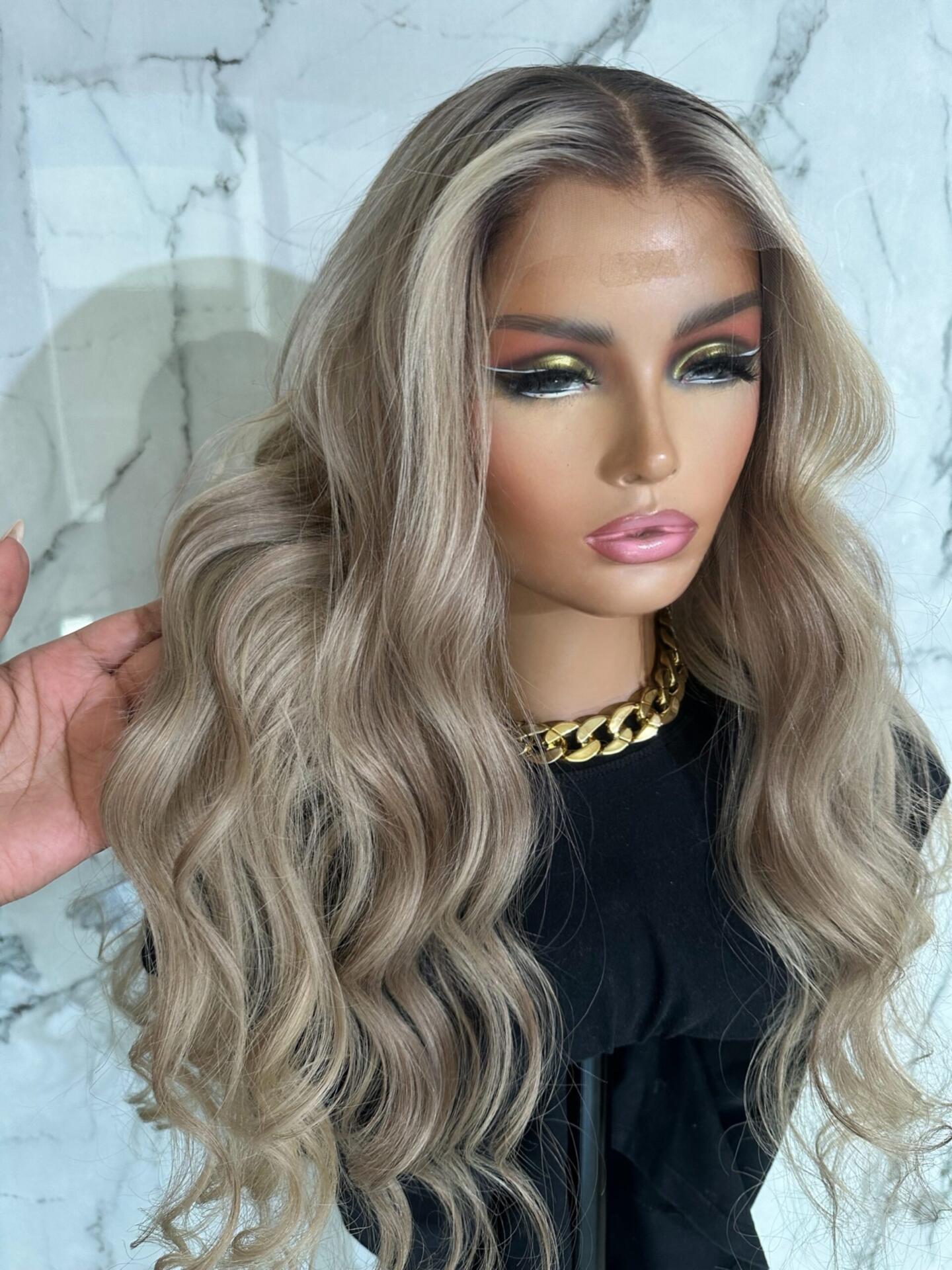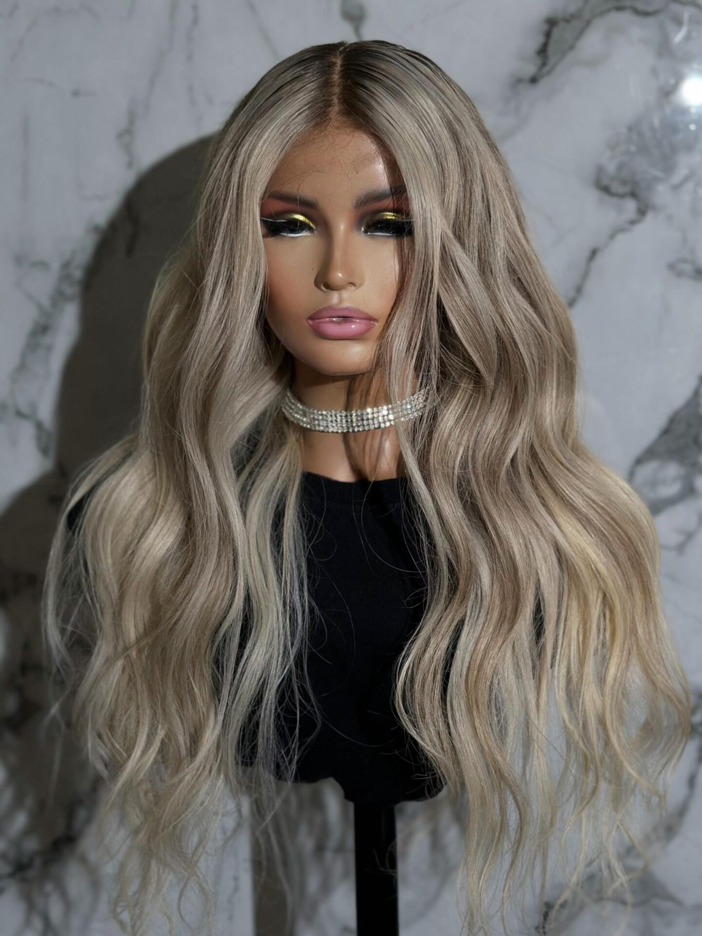 This luxury ash blonde wavy wig features a refined blend of cool beige, ash blonde, and soft root shading, creating an ultra-natural, high-end color result. The subtle contrast at the roots adds depth and realism, while the lighter lengths bring brightness and elegance.