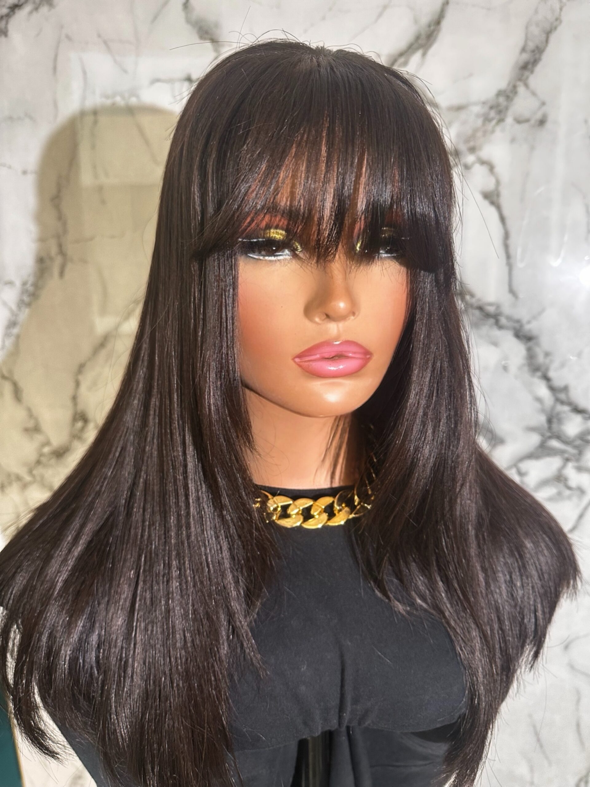 The full fringe (bangs) creates a beautifully face-framing effect, making Naomi ideal for everyday wear and effortless styling. With no lace required at the front, this wig is perfect for a quick, secure install and a clean, elegant finish.